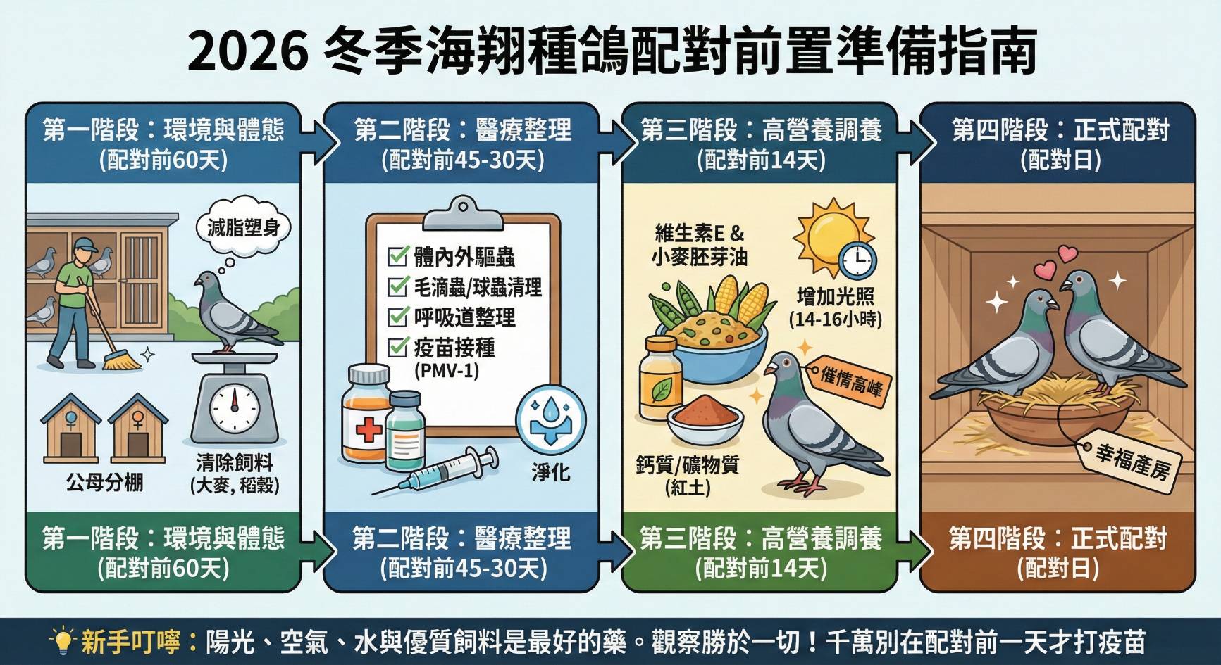 針對 2026 年冬季海翔,現在(1 月底)正是開始規劃「種鴿調養」與「環境準備」的黃金時機。 台灣冬季海翔(北海或南海)通常在 4 月至 5 月間進行配對(具體依各鴿協掛環時間而定),為了讓幼鴿在出生時就贏在起跑點,你的準備工作必須提前 2 到 3 個月開始。 這是一份為新手量身打造的 「種鴿配對前置作業指南」: