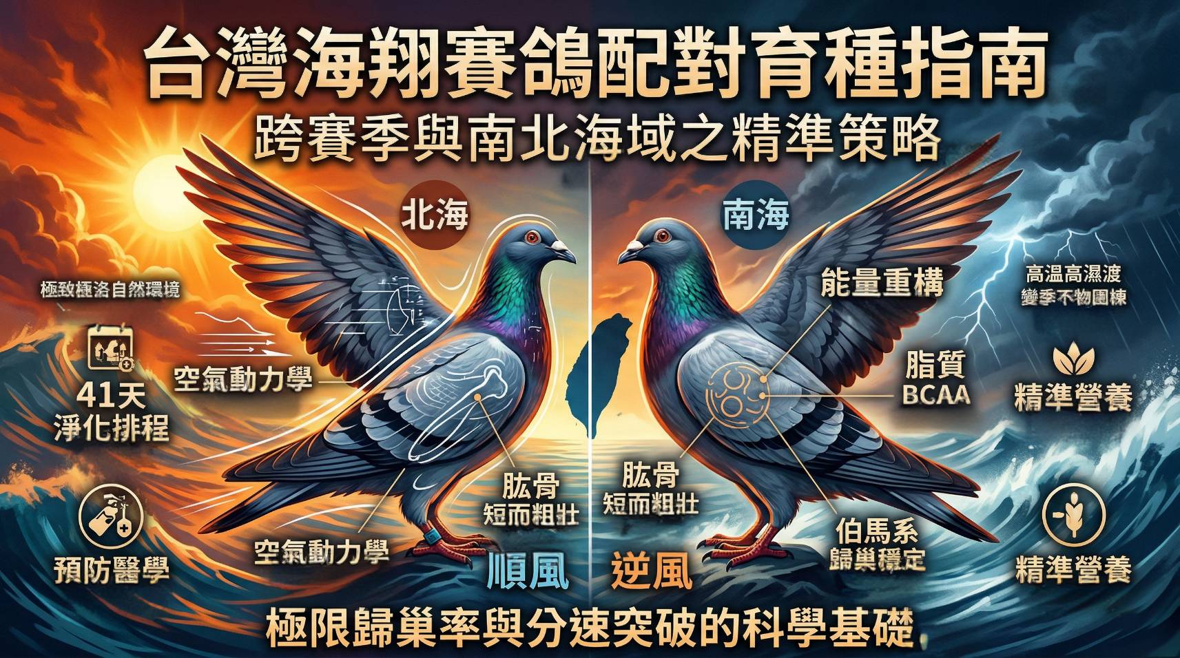 台灣海翔競賽賽鴿配對育種全方位科學指南:跨賽季與南北海域之精準策略 台灣的海翔賽鴿運動,長久以來被全球鴿界公認為難度最高、氣候條件最為嚴苛的鳥類飛行競技之一。在這項完全沒有陸地補給站、必須憑藉單一飛行航線橫越波濤洶湧之汪洋的極限挑戰中,賽鴿無時無刻不面臨著高溫、高濕度、多變且難以預測的季風風向,以及茫茫大海上毫無地標可供視覺導航的嚴峻生存考驗。要在這樣極端的自然環境中脫穎而出,無論是面對春季、夏季、秋季還是冬季的任何一個賽季,抑或是面臨順風為主的北海賽制與逆風為主的南海賽制,傳統僅憑藉肉眼觀察與主觀經驗的法則早已不敷使用。現代化頂尖鴿舍的核心競爭力,建立在全面的科學化育種與配對策略之上,這涵蓋了寄生蟲與病原體的預防醫學淨化、空氣動力學的精準型態篩選、細胞代謝途徑的營養調控,以及跨越血統的遺傳學精準互補。 本研究報告旨在透過深度解析賽鴿生理學、環境工程學、空氣動力學與遺傳育種學,提供一套完全適用於台灣南北海翔賽制、跨越所有賽季的系統性配對與育種指南,為追求極限歸巢率與突破分速極限的賽鴿繁育,奠定無可撼動的科學基礎。